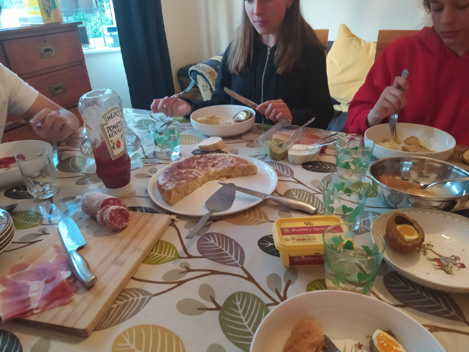 Full board accommodation, with packed lunch (like sandwich, fruit and water) is included. Here are listed the types of diet we eat at home and that we would provide without extra charges. In general we eat traditional but also international food, breakfast is light and dinner our main meal. Your packed lunch will include one or two sandwiches, please let me know over the phone what you would like. We made pizza at home. Eat out sometimes. Prepare food together at times.